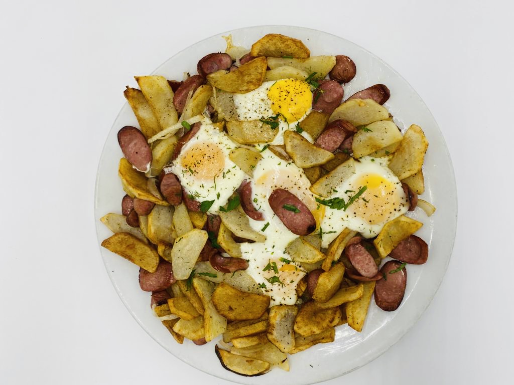 Home-style fried potatoes, cooked until crispy. No onions or mushrooms added.